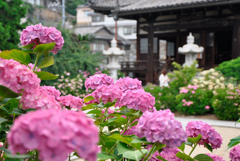 One of the temples of "Onomichi 7-Temple Tour". Big stone gate, made with 36 pieces of stone cut and carried from Nichirin-San in the back of the temple is said that the power from those big stones lengthen the lifespan when passing the gate. Temple is also famous for its beautiful seasonal flowers and called "Hydrangea Temple".