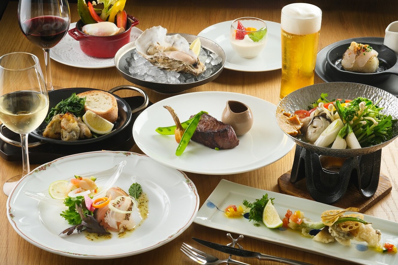 牡蠣やカルパッチョ、布刈瀬戸の鯛など新鮮な魚介類をはじめ、峠下牛の厚切りステーキもお楽しみいただける、シェフこだわりの忘新年会限定オリジナルメニューとともに、120分の飲み放題が付いた大変お得なプランでございます。