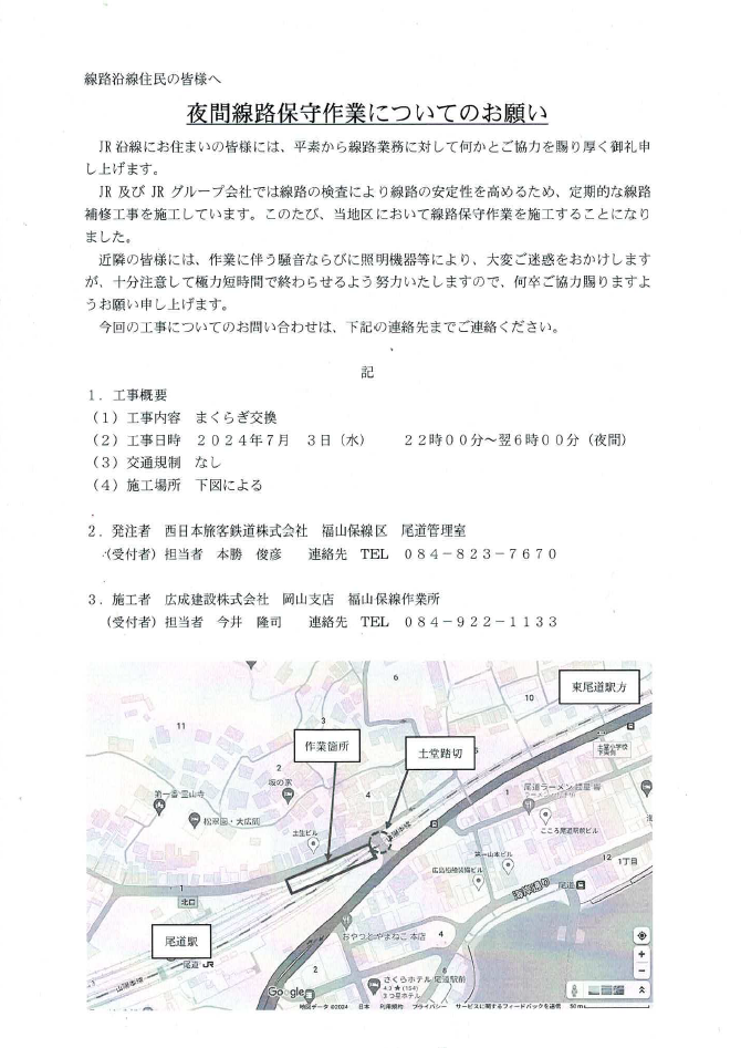 JR尾道駅 夜間線路保守作業についてのお知らせ